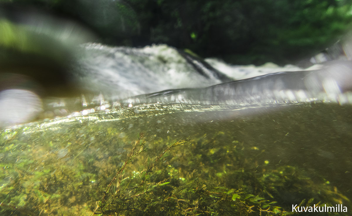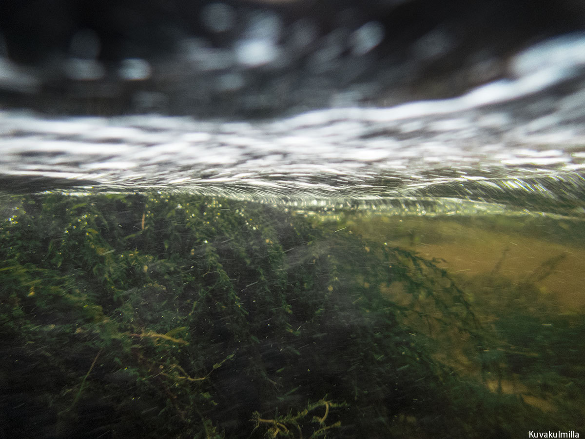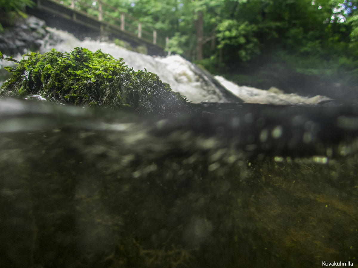 Aivan veden pinnasta otettu kuva tarkentui sammaleiseen kiveen.