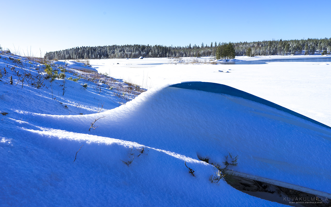 Lumeen hautautuneet veneet sinisen taivaan alla / Snow covered boats under the blue sky