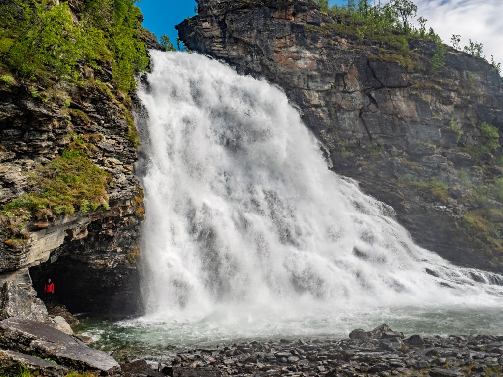 Lähdimme parkkialueelta putoukselle lyhyttä ja jyrkkää polkua pitkin. Mitä lähemmäs putouksen alaosaa pääsimme, sitä voimakkaammaksi Rovijoen pauhu yltyi. Vaikeakulkuisen polun alapäässä odotti huikea näky. Vesi törmäsi kivikkoiseen joenuomaan 30 metrin pudotuksen jälkeen. Alas iskeytyvä vesi sumusi laaksossa aaltoina. Välillä putousta sai ihailla kuivassa auringonpaisteessa. Aika-ajoin tuulenpuuska toi mukanaan sumusadetta kastellen vaatteet kevyesti.
