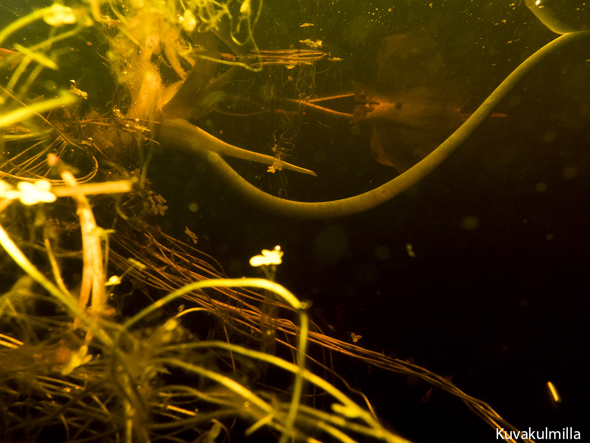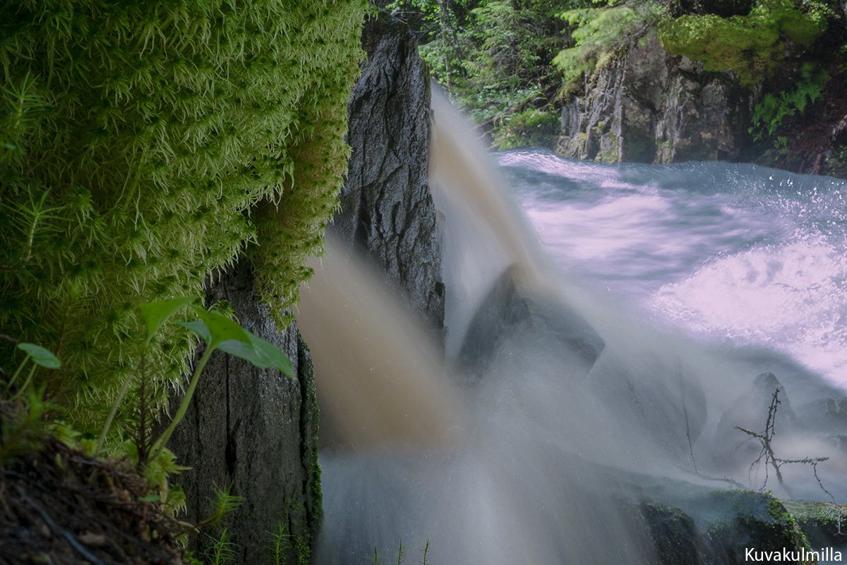 Hyvin pitkä valotus, esimerkiksi 10 sekuntia saa ison putouksen näyttämään jättimäiseltä blurrimuodostelmalta. Jos putouksen edessä on allas tai suvanto, voi siitä saada hyvin pitkällä valotuksella esiin pyörteitä, joita silmä ei hahmota lyhyillä valotuksella otetuista kuvista. Kannattaa siis kokeilla pitkää valotusta paikoissa, joissa vesi putoaa altaaseen. Esimerkiksi Puolangan Hepokönkäällä putouksen kanssa samaan altaaseen laskee pieni oja. Tällaisia erisuuntaisia virtauksia ei saa näkyville ilman hyvin pitkää valotusta. Kitkajoen Myllykosken alasuvanto on monissa matkailuesitteissä kuvattu noin minuutin valotusajalla, kuten alla. Muista varmistaa etukäteen kamerastasi kuinka pitkäksi valotusajan saa säädettyä. Usein maksimiarvo on 30 sekuntia. Tämä ei välttämättä riitä ison altaan pyörteen kuvaamiseen. Pystyt käyttämään pidempää valotusaikaa erillisellä kaukosäätimellä tai lataamalla remote -sovelluksen puhelimeesi.