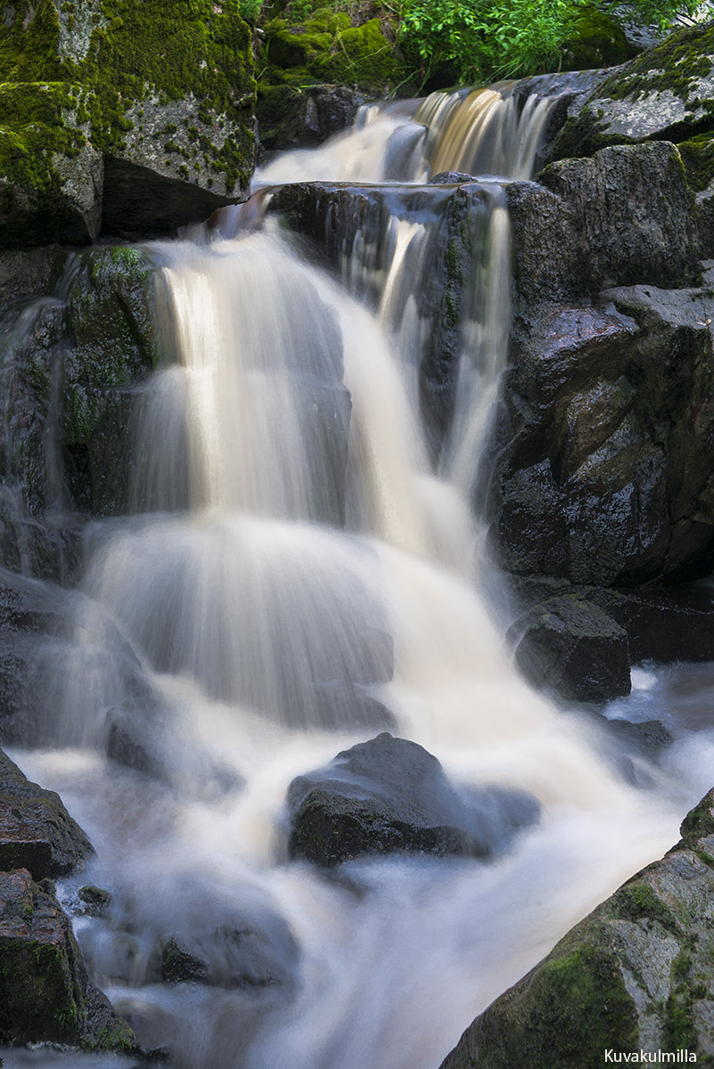 1) Jalusta. Pitkä suljinaika tuo mukanansa pari vaatimusta. Kun kuvanvakaaja ei enää kykene pitämään ympäröivää maisemaa vakaana, pitää käyttää jalustaa. Hyvä jalusta on tukeva, kestää vettä, eikä kaadu virtauksessa. Pidän itse jalustan säätönopeutta ja monipuolisuutta tärkeänä. Nopeus on paljon kiinni lukkojen, kierteiden/jenkatappien ja kahvojen/vipstaakien laadusta. Vesiputouksia kuvataan usein virtaavassa vedessä. Saappaiden alla on mukuraisia, liukkaita kiviä. Sääsket ja mäkärät syövät ja hiki virtaa. Juuri kun kameran säädöt ovat kohdillaan, pitääkin paikkaa siirtää 40 senttiä. Jos jalusta ei tässä tilanteessa säädy nopeasti uuteen asentoon, saattaa innostus kuvaamiseen lopahtaa äkkiä. Asiantunteva valokuvakauppa osaa neuvoa jalustankin valinnassa. Seinäjoen Foto-Forman suosittelema Manfrotton jalusta on toiminut minun käytössäni erittäin hyvin.