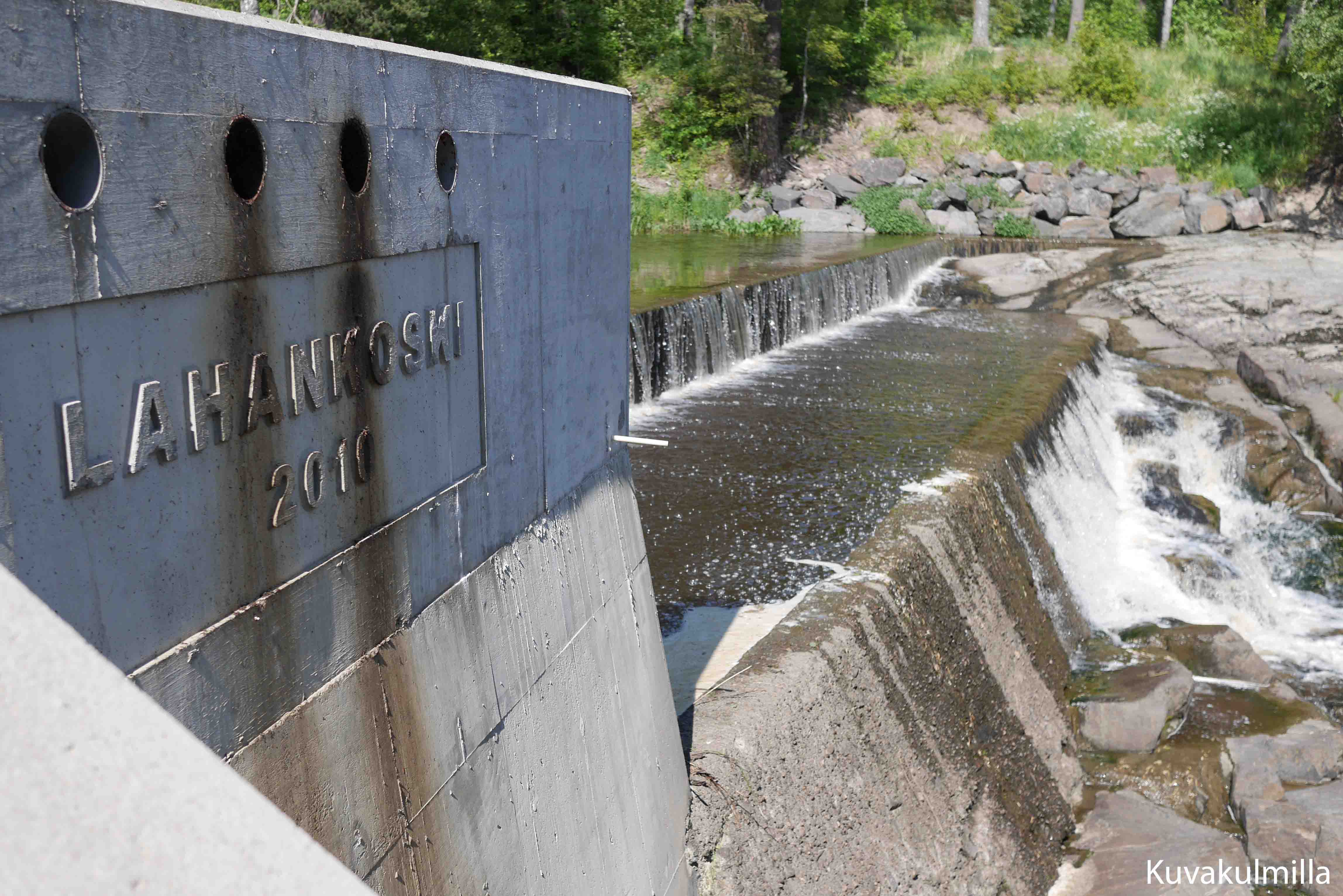 Putousalue koko leveydeltään.Hennompi osa putousta, keväältä tässäkin on varmasti kova virtaus.Keskellä kesää putouksessa vesi virtasi pääosin tästä uomasta, minkä niskalla näkyy vanhasta myllyn perustuksesta murtunut osa.Putouksen itäpuolella oli hieno kallioranta.Lahankosken uusi, vuonna 2010 rakennettu ylisyöksypato.Vasemmalta pato, mistä vesi johdetaan voimalalle yli metrin halkaisijaltaan olevaa ja yli 50 metriä pitkää puuputkea pitkin.Puuputki ja 500 kW:n voimala.Vasemmalla voimalaitosrakennus, oikealla padon alapuolista koskea.Lahankosken alajuoksua voimalaitoksen vieressä.Lahankosken alajuoksua voimalaitoksen vieressä.