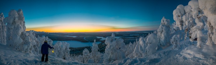 Värejä voi löytyä ”valmiina” maisemasta tai voit luoda niitä itse. Alla olevassa panoraamassa auringonlaskuun katsova poika ja lyhty tuovat tunteikkaan lisäelementin valkoisen lumen keskelle.
