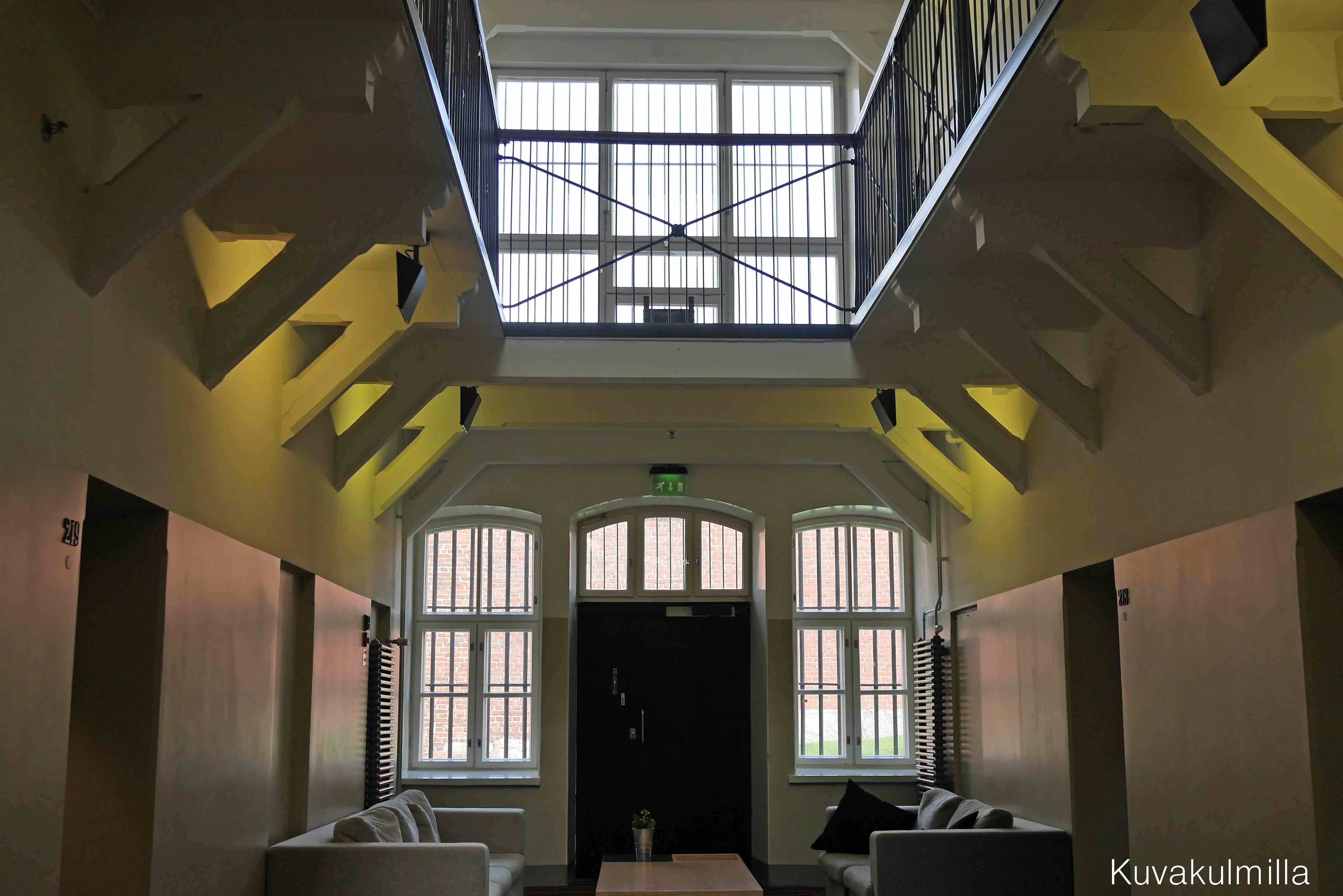 Paksut seinät ja pienet ikkunat yhdistettynä aurinkoiseen ulkoilmaan saavat aikaan voimakkaan kontrastin.Kongilla.Porraskäytävät ovat todella kauniita.Perinteinen tapa rakentaa vankilan kongit näkyy Katajanokalla. Kerrosten käytävät ovat keskeltä auki ylä- ja alakerroksiin.Katajanokalla hotellihuoneet on rempattu kongeille, eli vanhoille vankilan käytäville.Sisätiloissa on onnistuttu hienosti säilyttämään vanha arkkitehtuuri.Katajanokan vankilan sisäänkäynti.