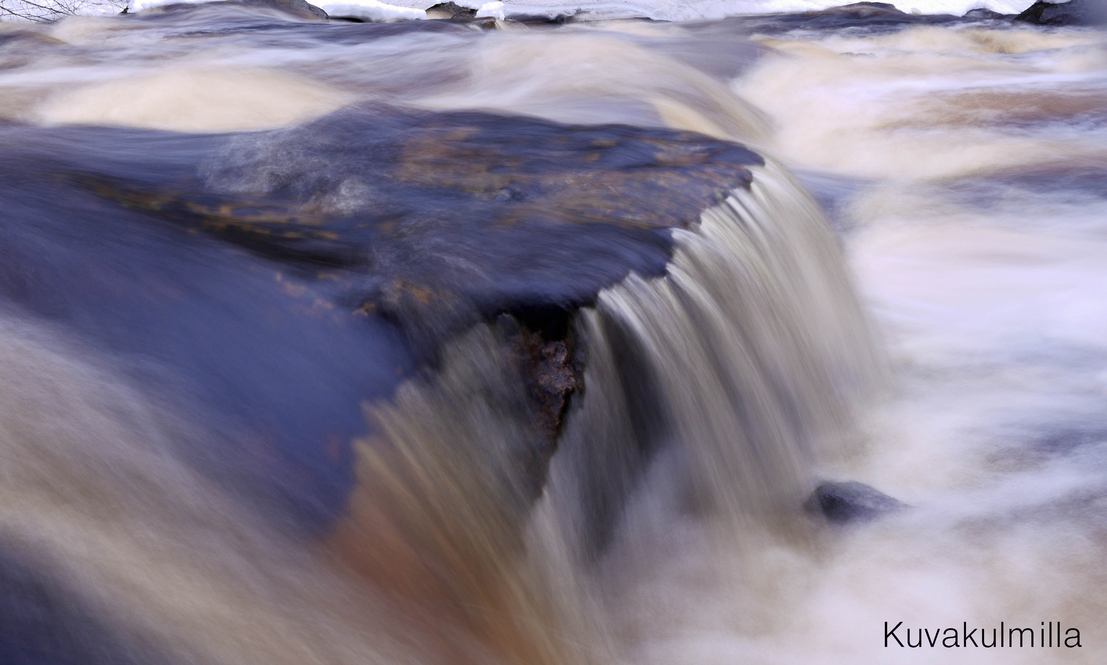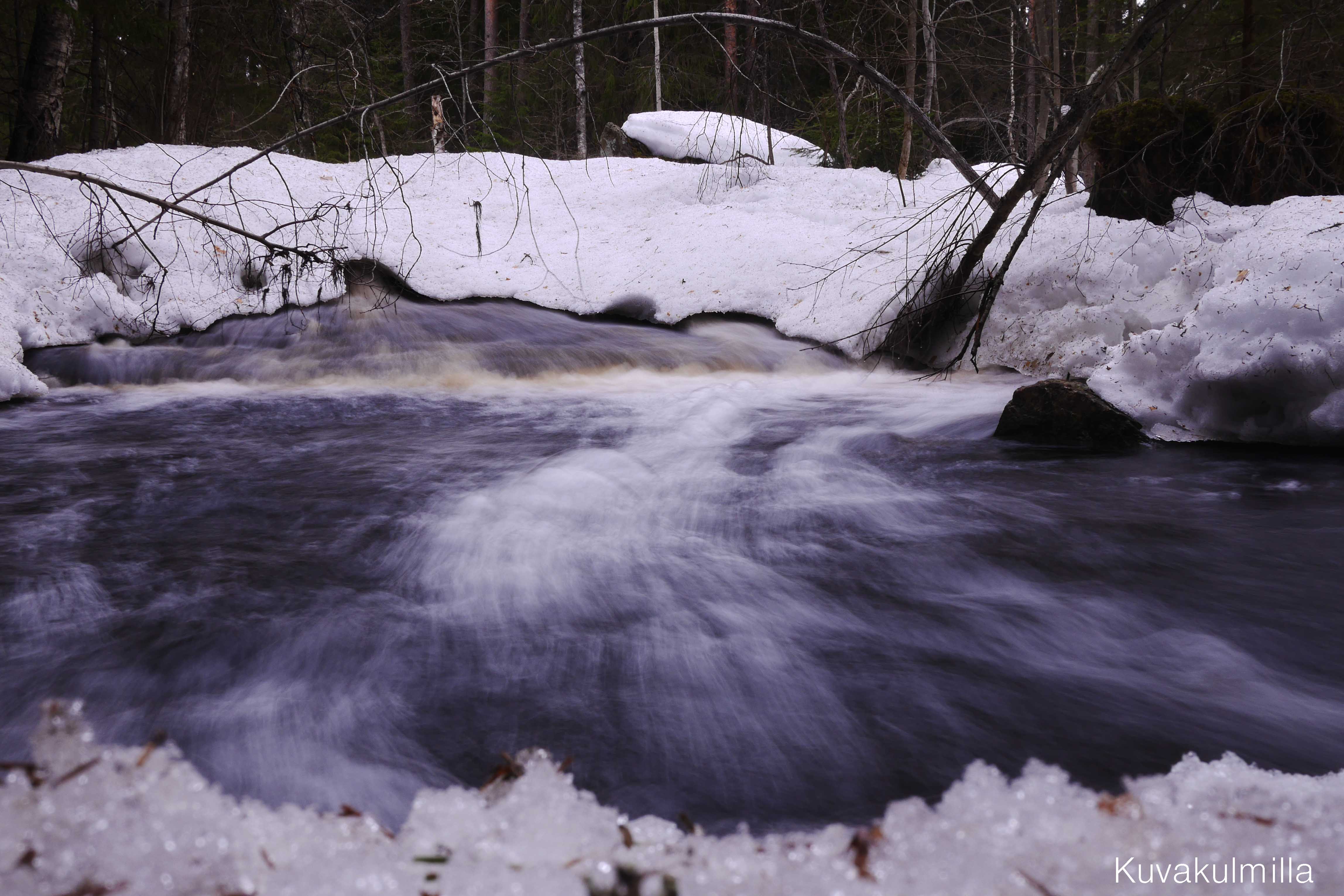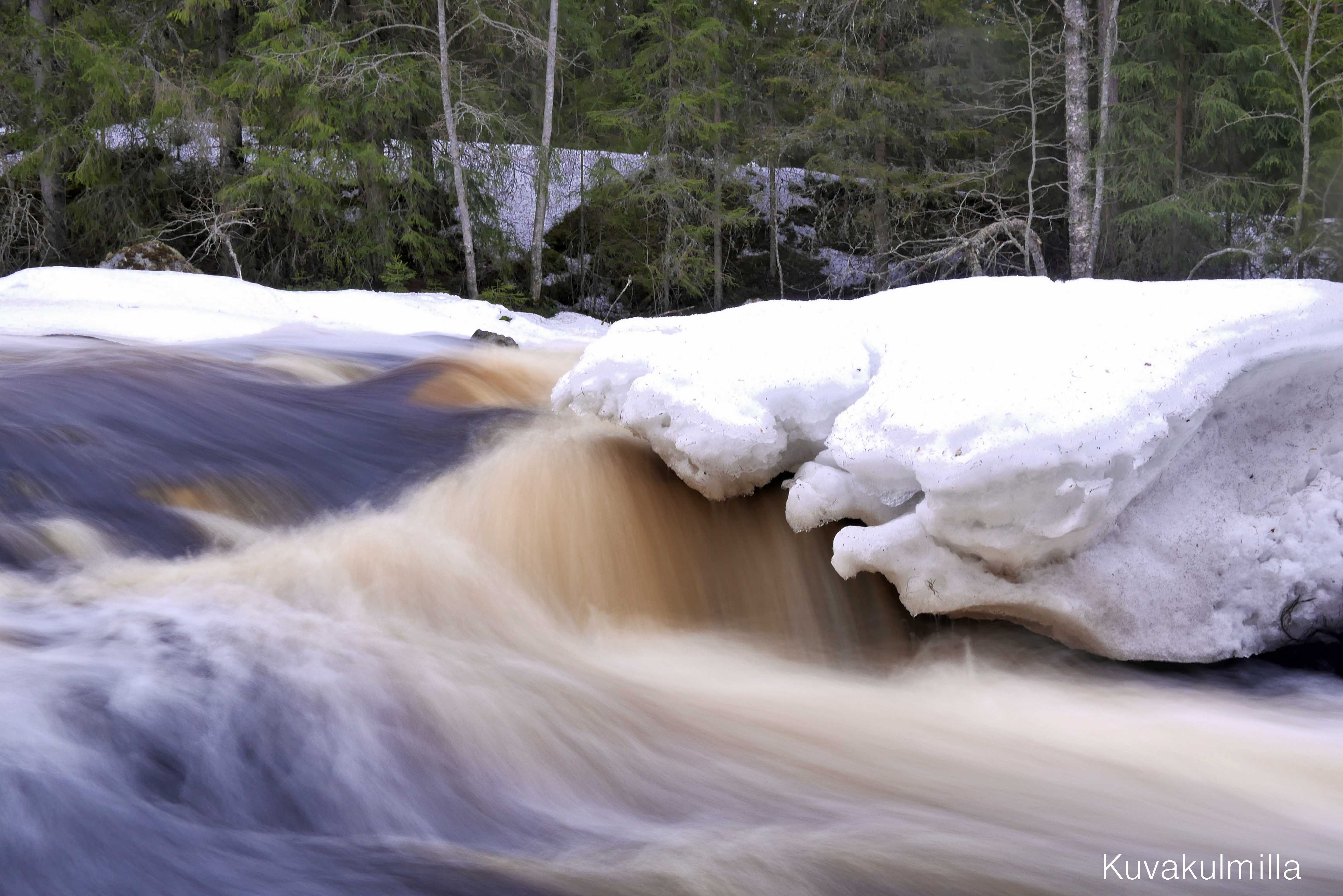 Multian Palsankoskella on yhä reilusti lunta ja yhä enemmän vettä. Tänään valoa oli niin paljon, että veden kuvaamisesta ei meinannut tulla mitään ilmaan lisäsuodinta kameraan. Harmaasuodin siis tilaukseen.