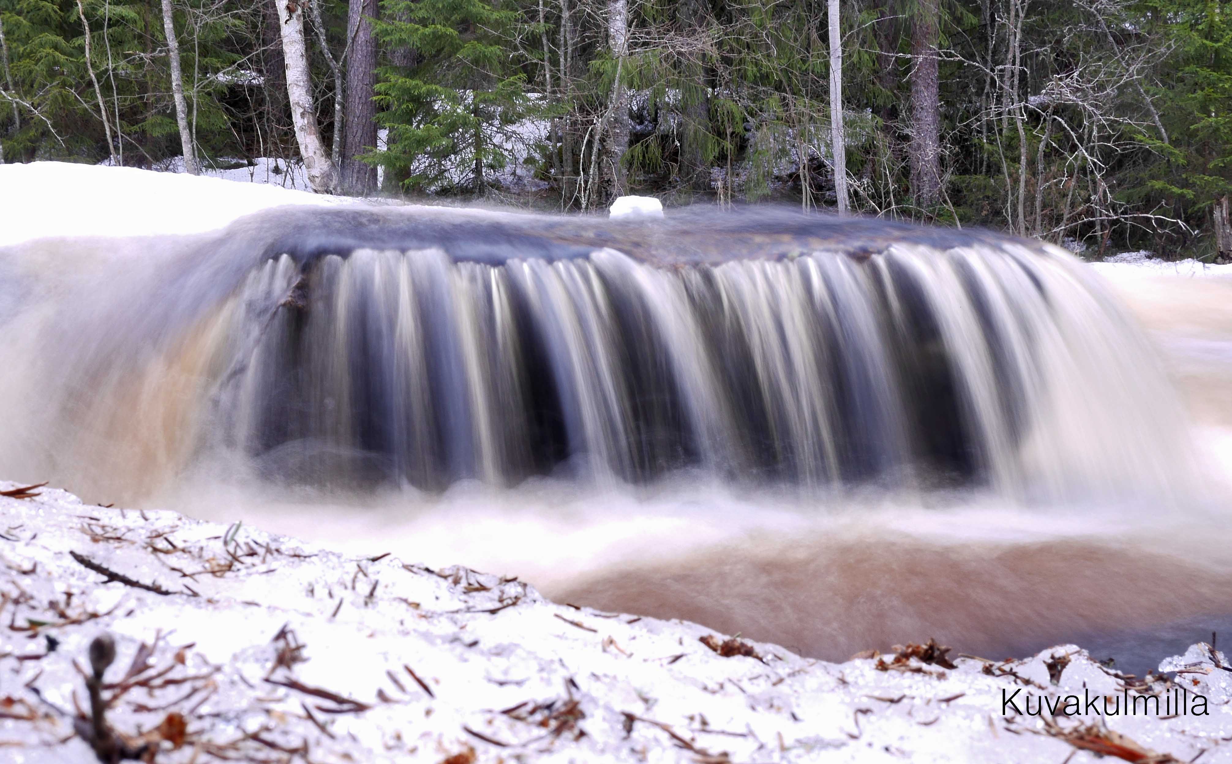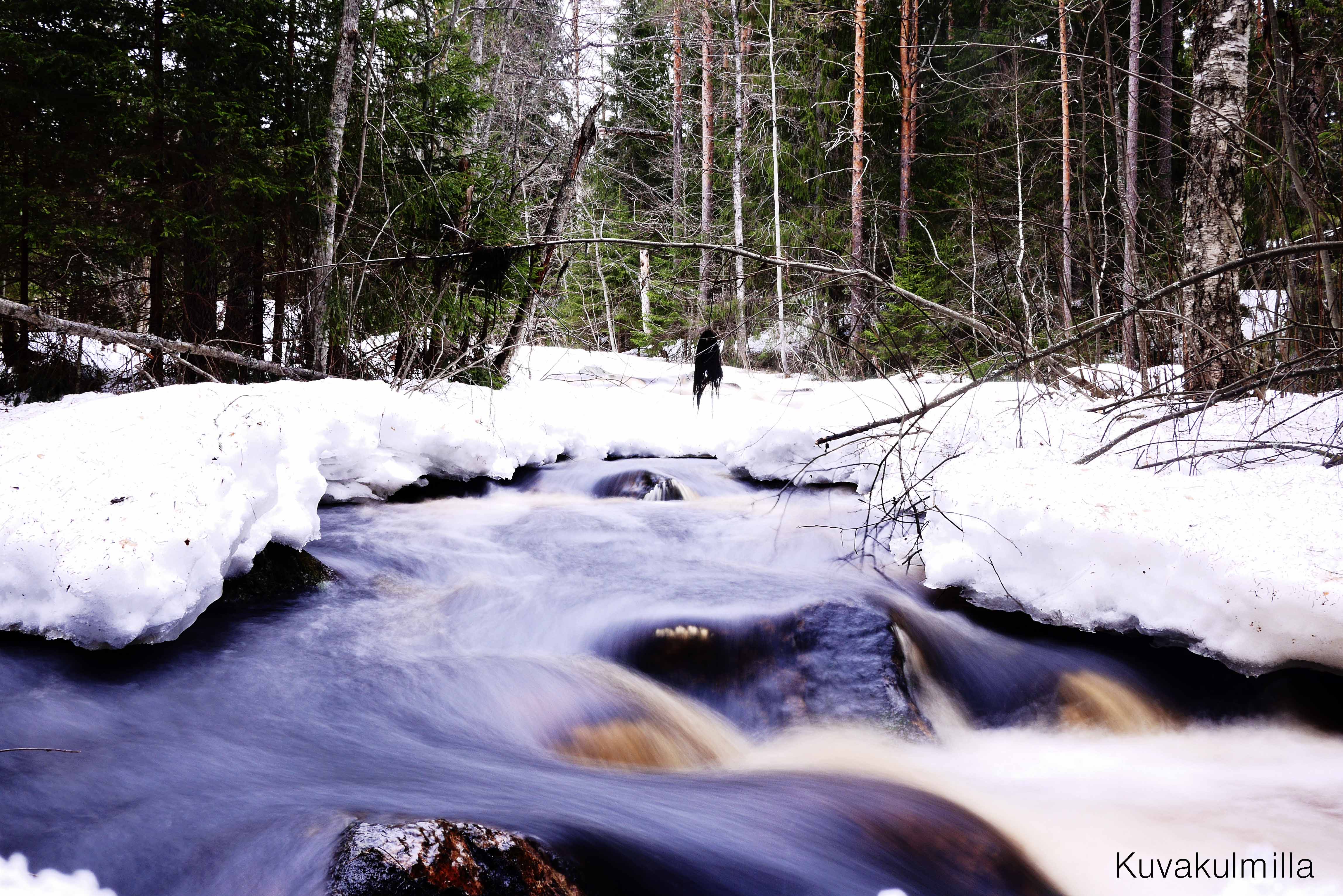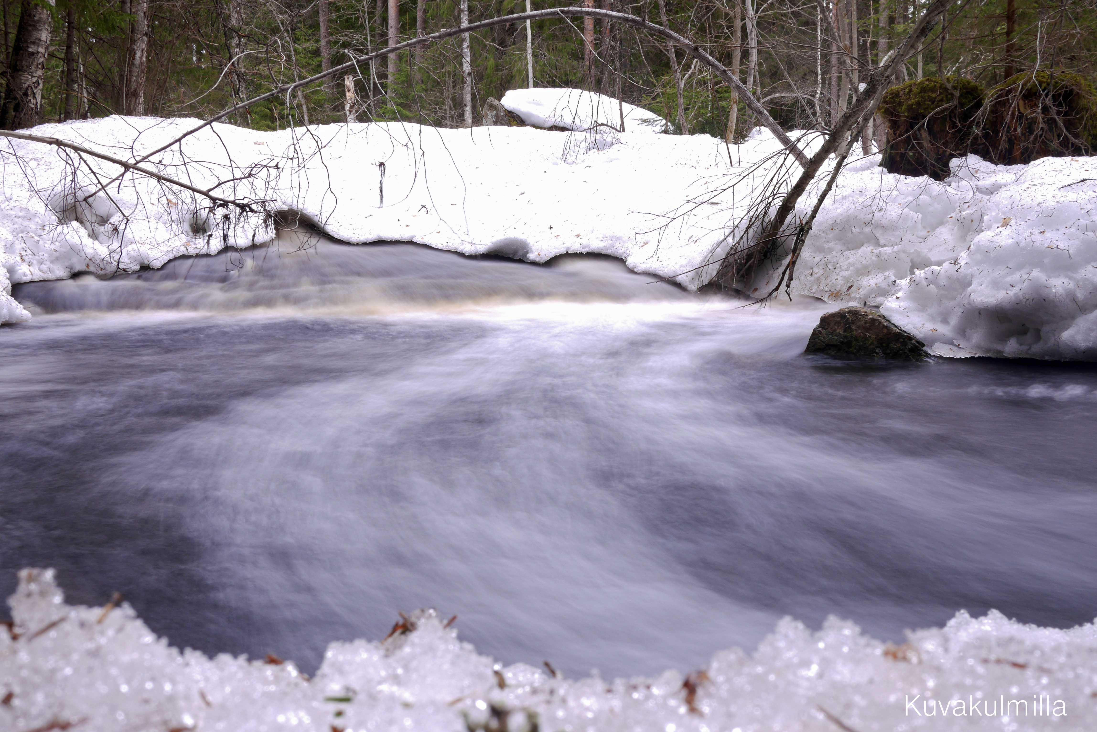 Multian Palsankoskella on yhä reilusti lunta ja yhä enemmän vettä. Tänään valoa oli niin paljon, että veden kuvaamisesta ei meinannut tulla mitään ilmaan lisäsuodinta kameraan. Harmaasuodin siis tilaukseen.