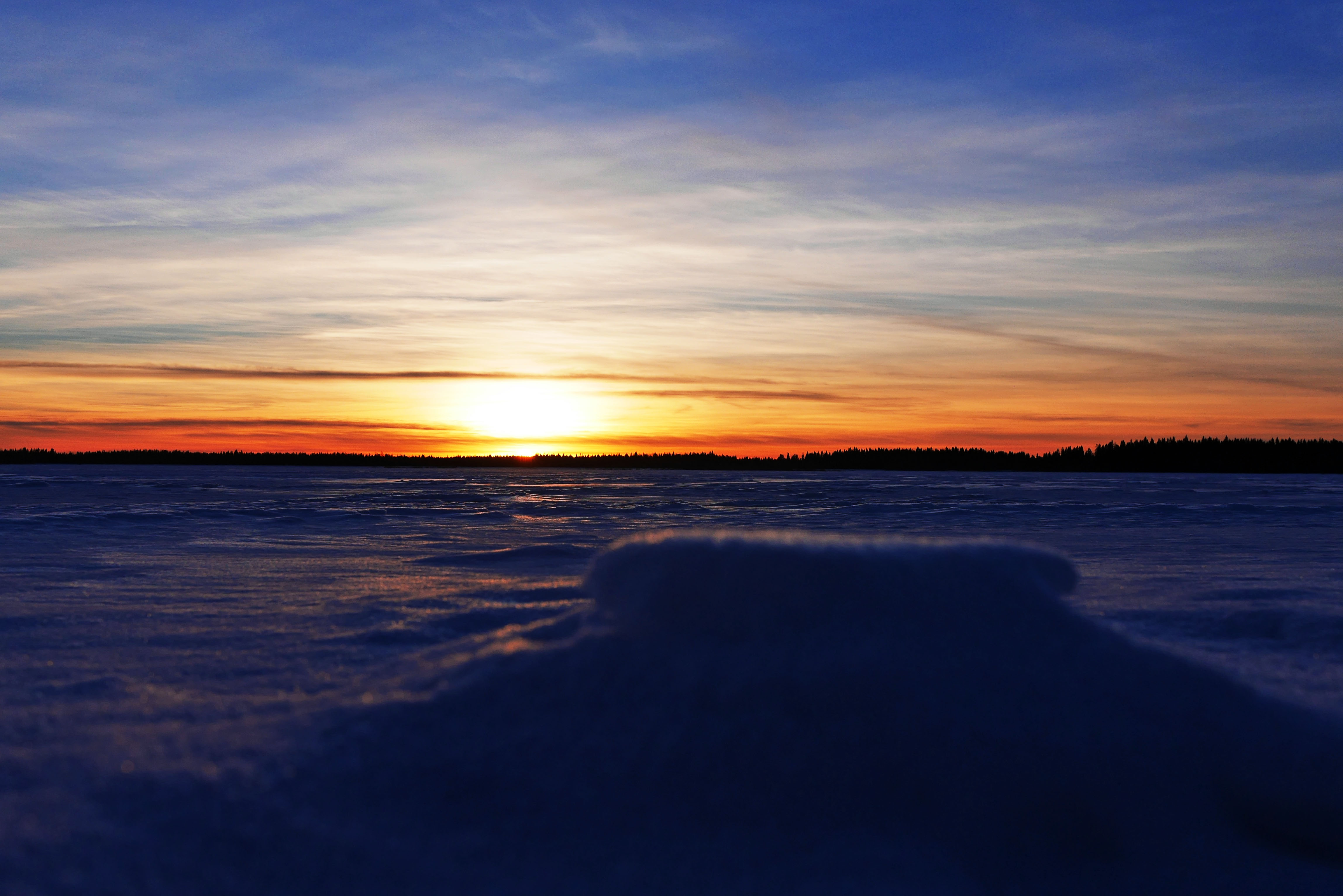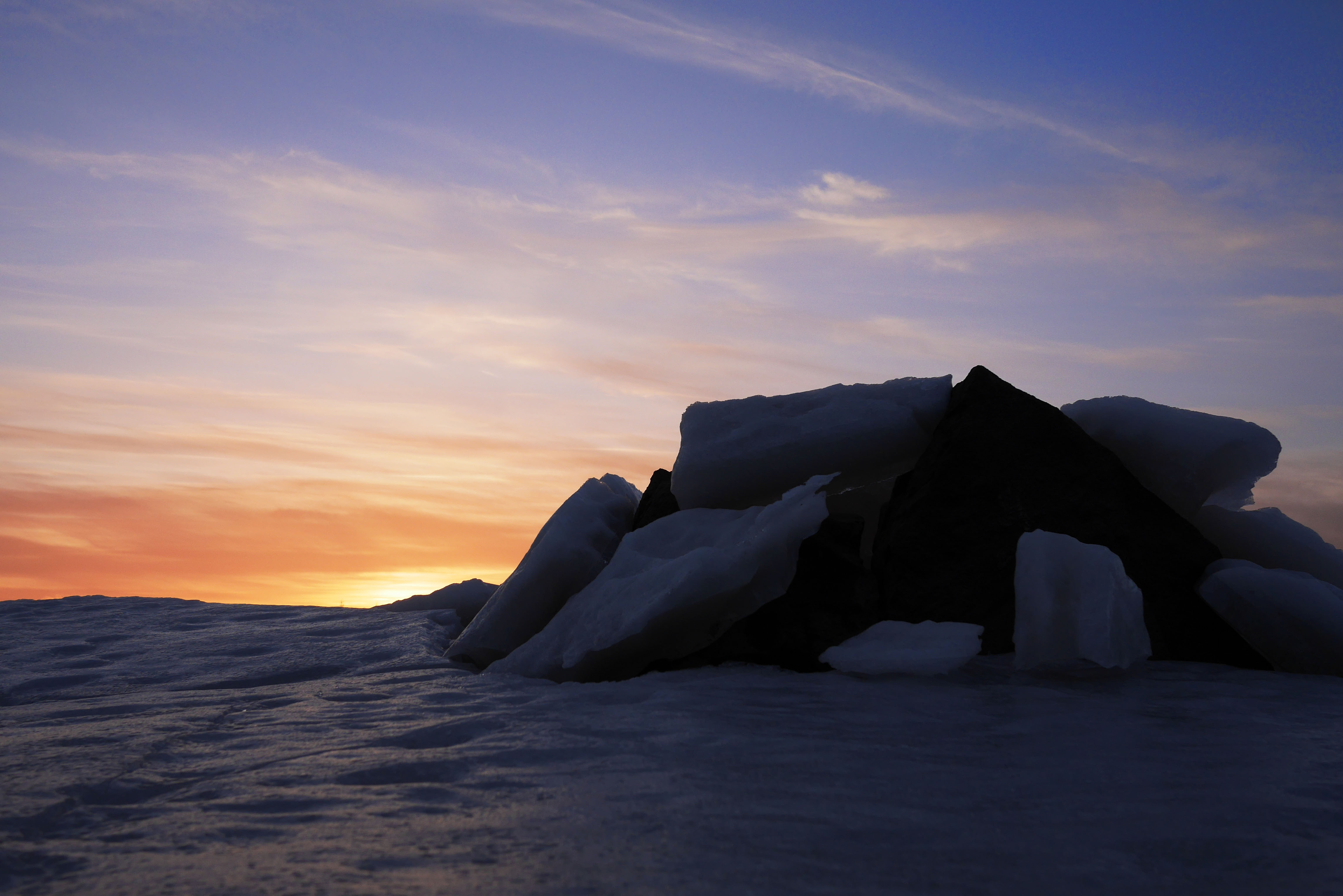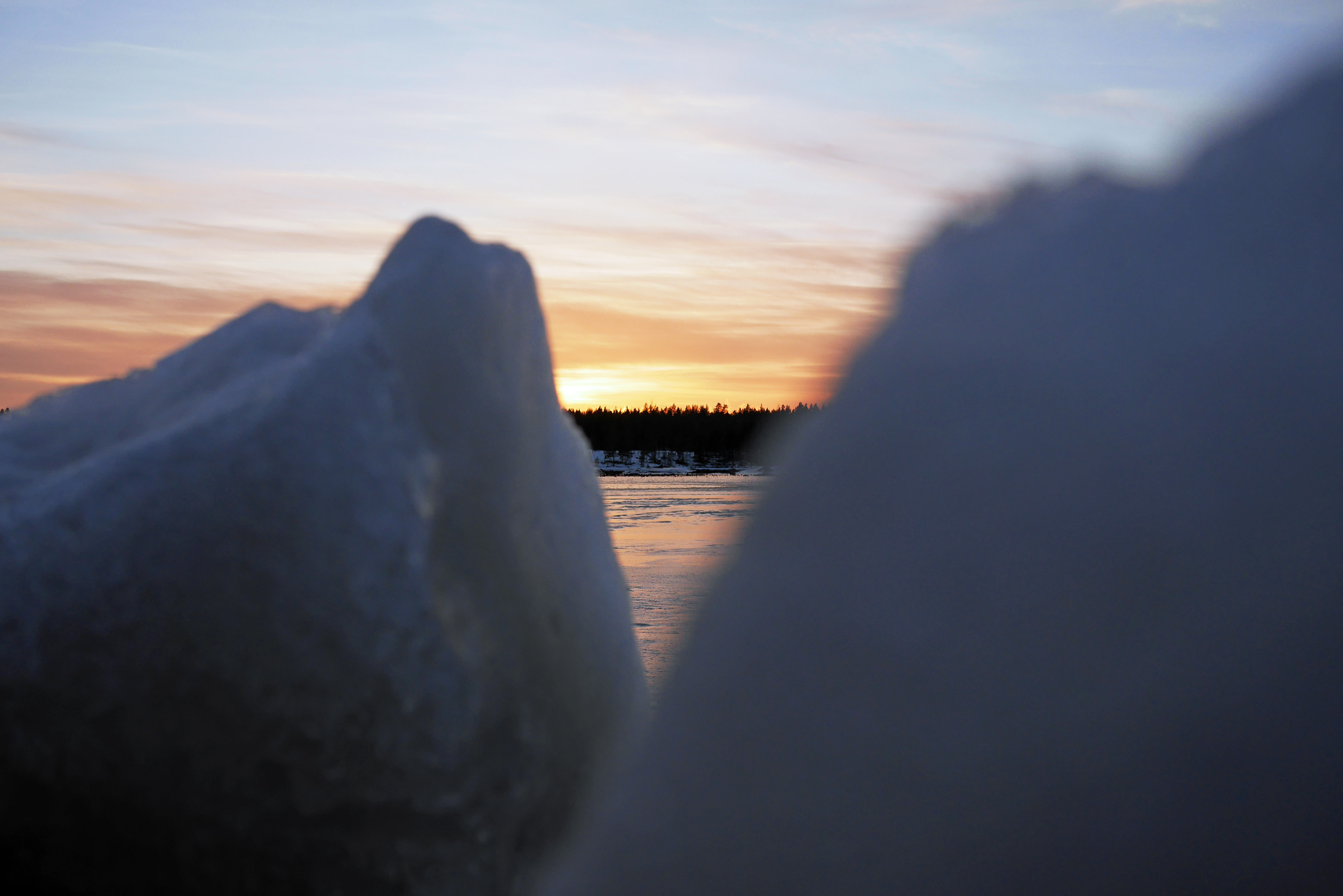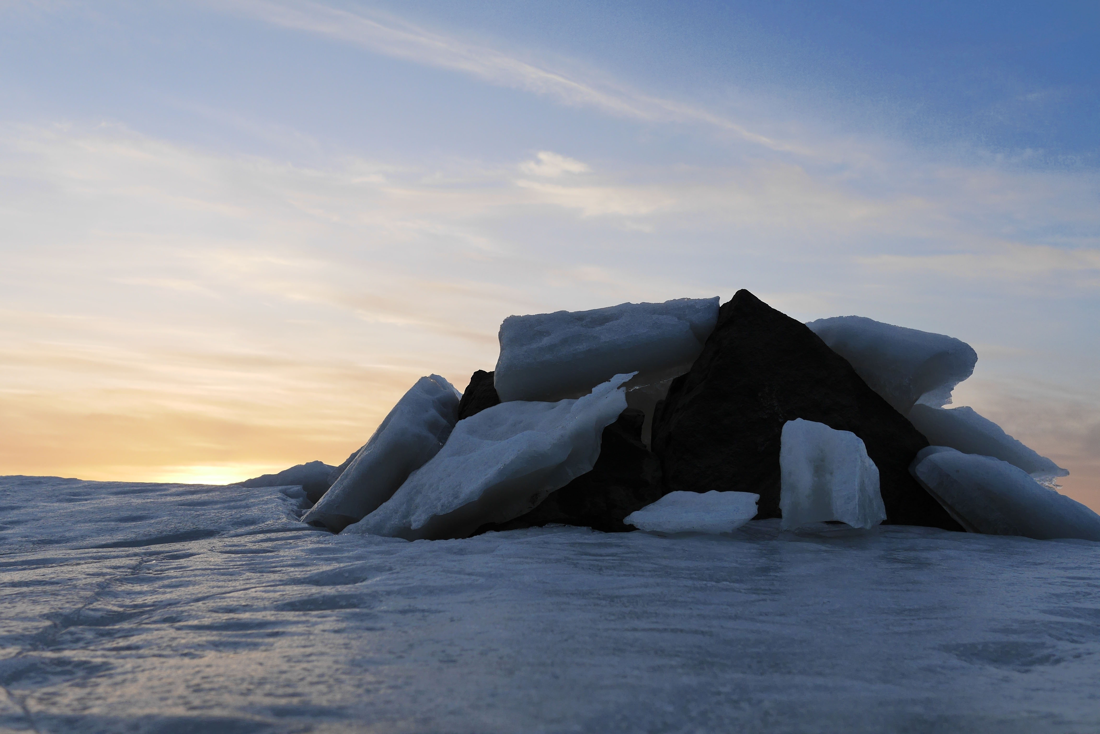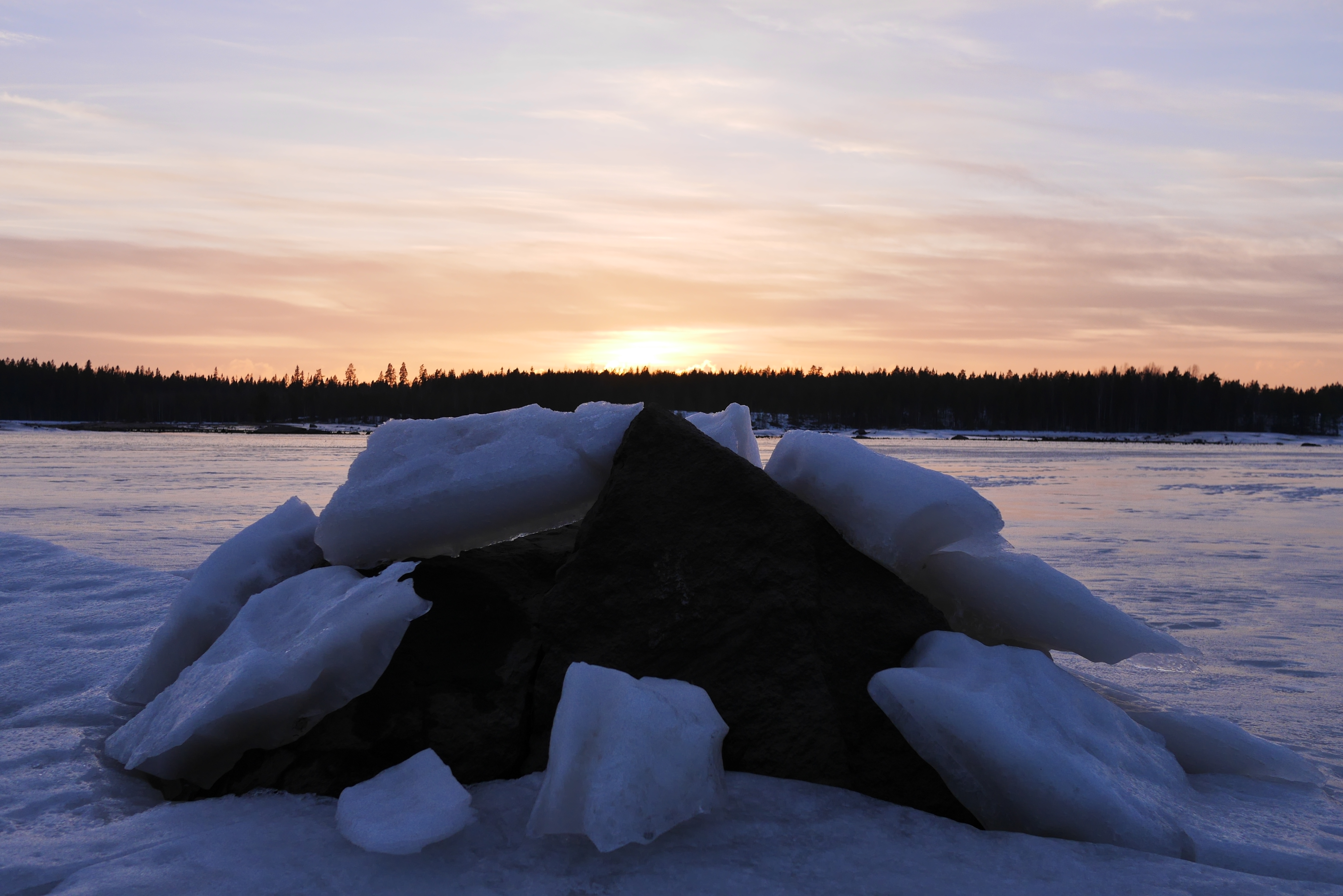 Harmaita ovat maaliskuun alun päivät Seinäjoen Kyrkösjärvellä. 1.3. oli valoisa poikkeus. Sain kuvattua jään läpi työntyneen kiven auringonlaskun aikaan. Todella massiivisen näyttävä yhdistelmä.