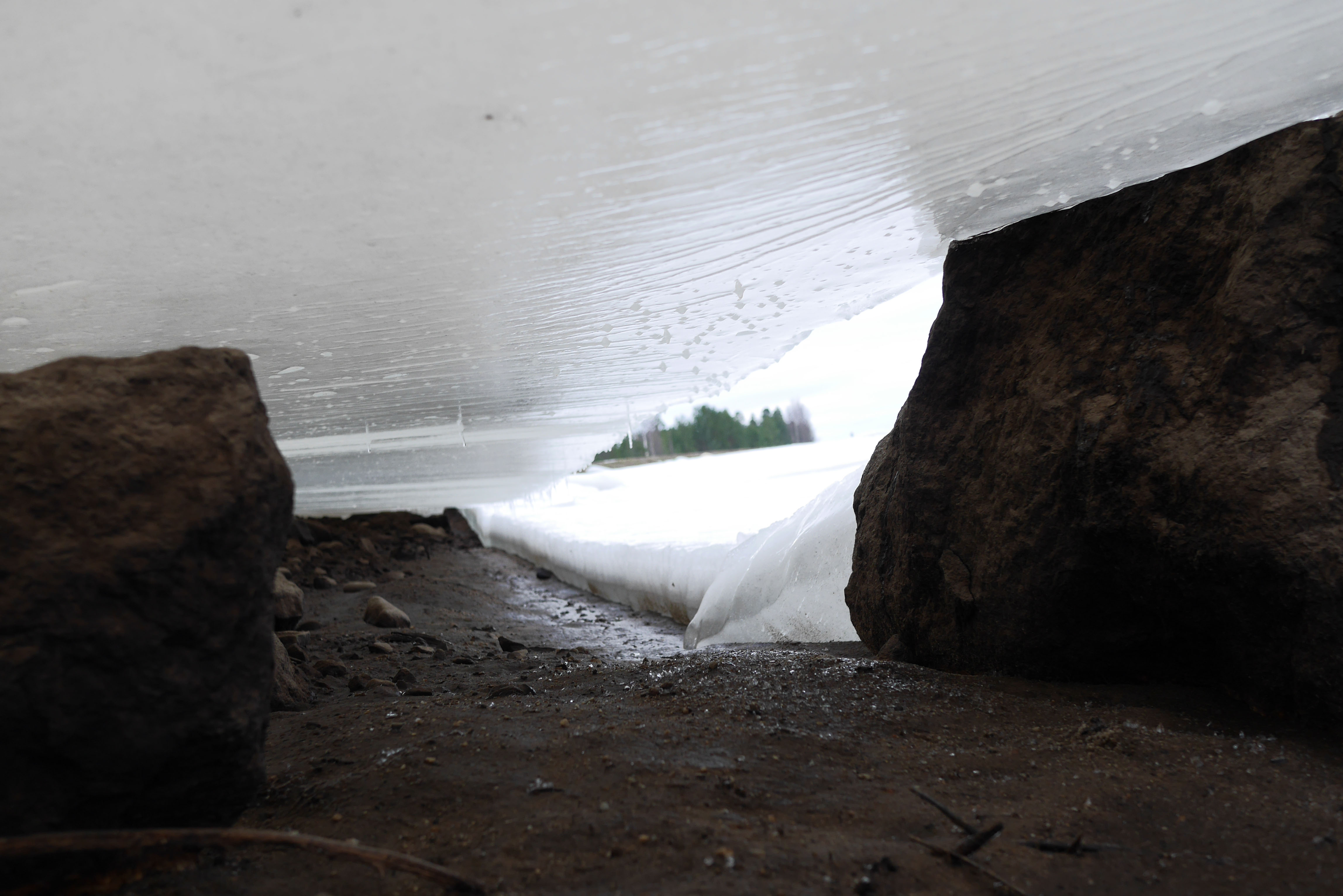Multian Palsankoskella riittää vielä lunta. Vesi on muodostanut lumeen hauskoja muotoja. Yhdessä on lohikäärme tai krokotiili?