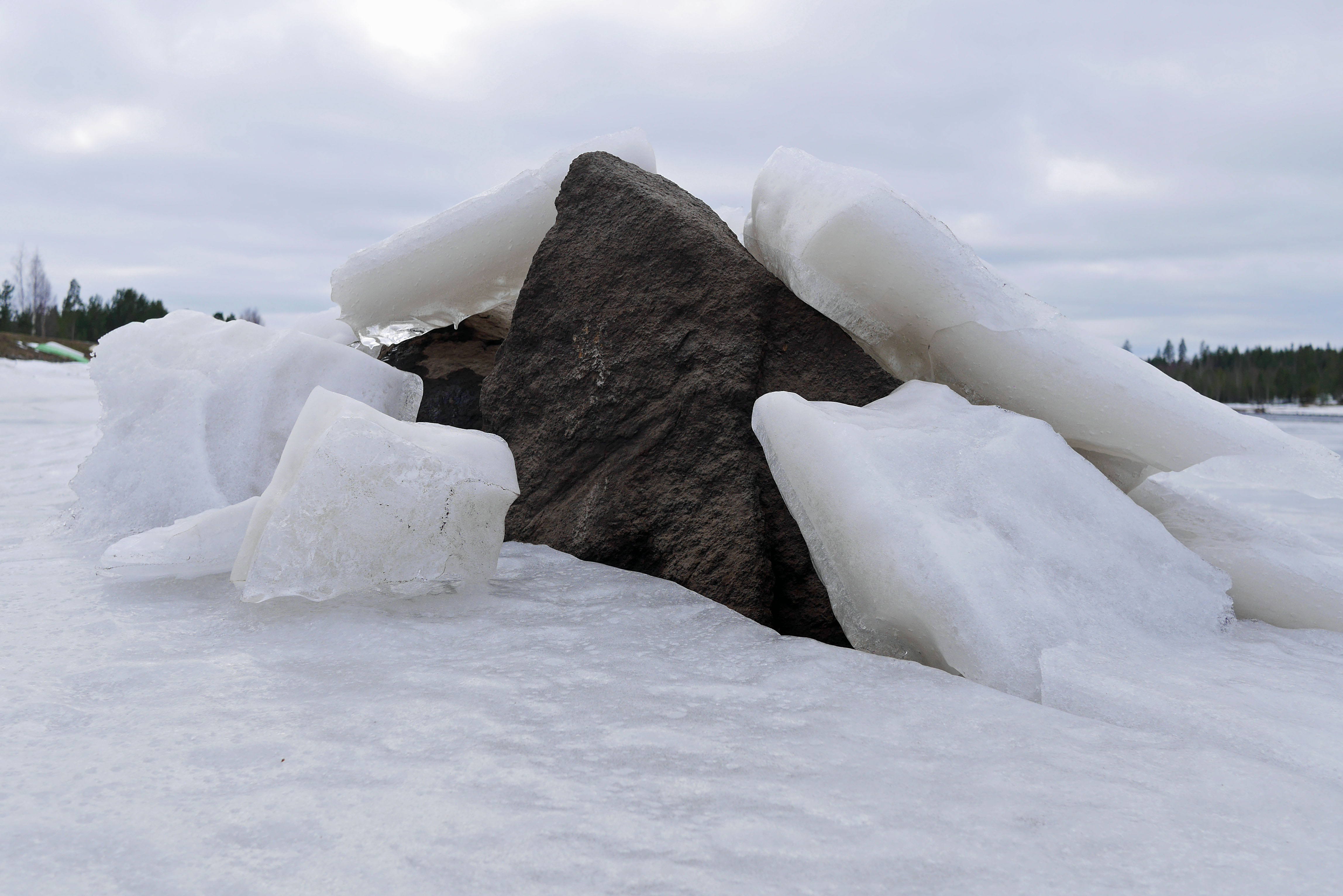 Kerta kiellon päälle! Jään ja kivien yhdistelmät muodostivat Kyrkösjärven rannalle sekä hauskan kolmion että ”Aalto maljakoita”.