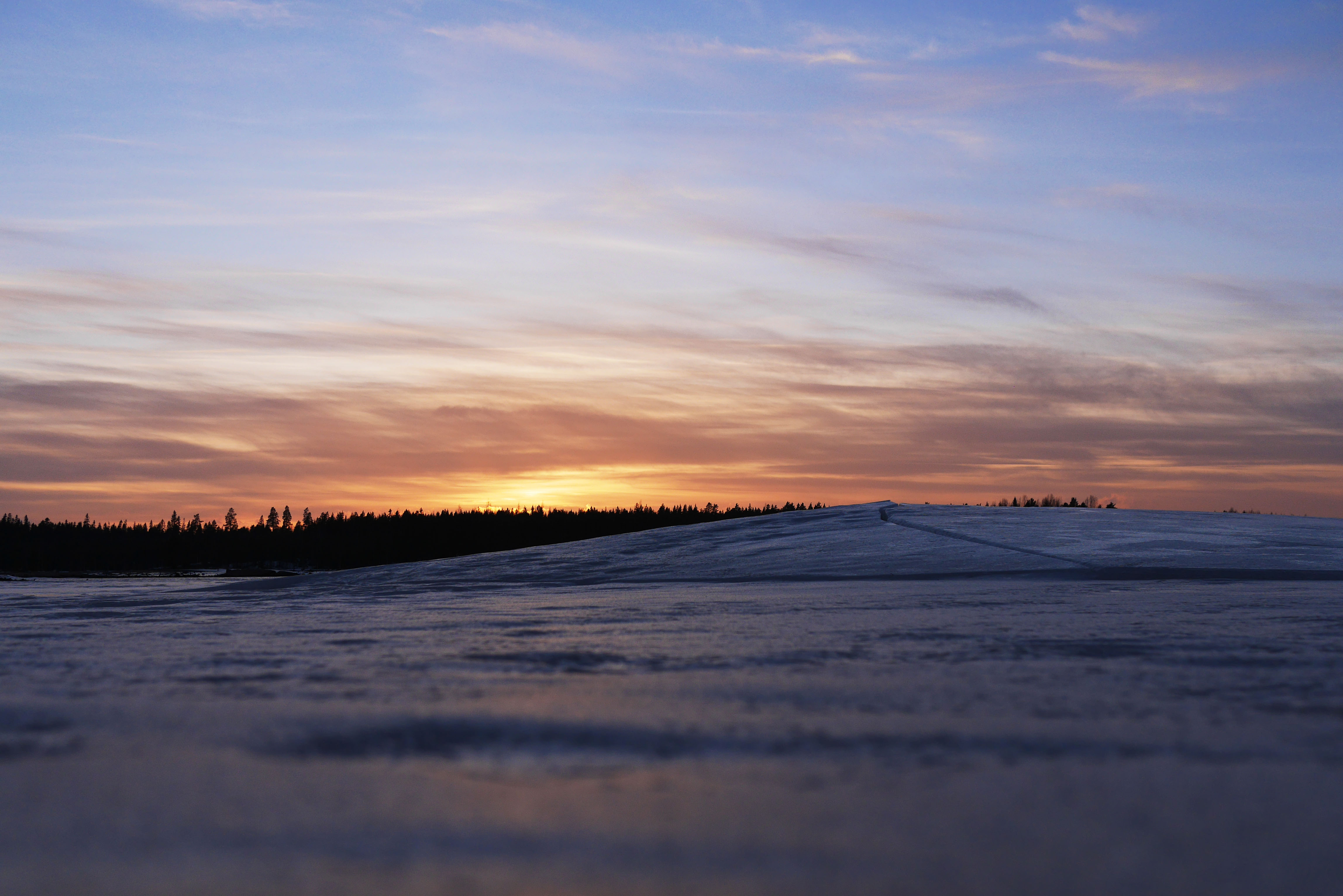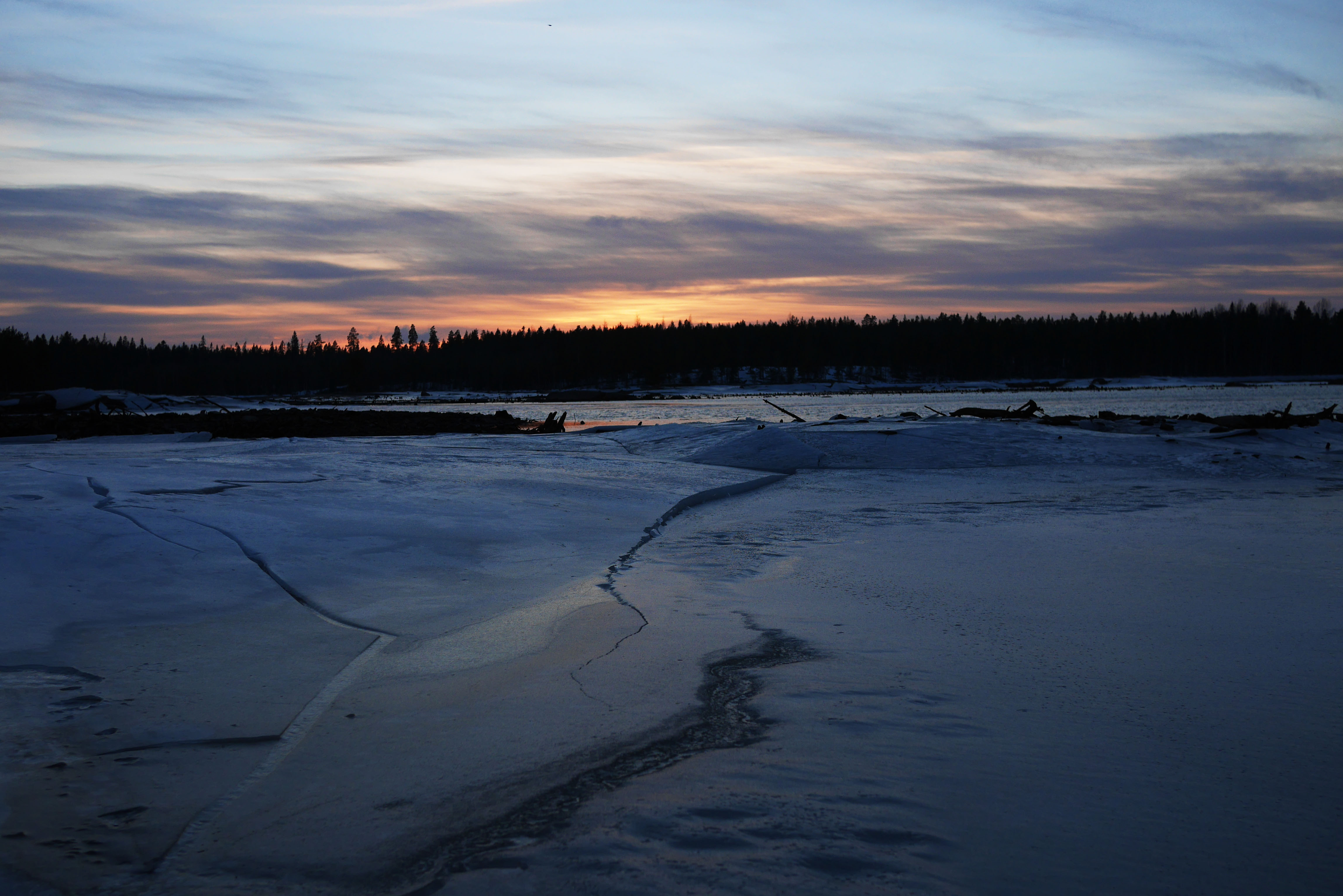 Kyrkösjärven tekojärven pinnan korkeus vaihtelee 2 metrin haarukalla, alimmillaan 79,25 m merenpinnasta ja korkeimmilllaan 81,25 metriä merenpinnasta. Talvella pinta saadaan laskea minimikorkeuteen, kesällä vaihteluväli on pienempi. Olen seuraillut järveä lähes päivittäin vuodesta 2007 alkaen. Muutamana talvena järvessä on ensin ehtinyt muodostua paksu jää ja sen jälkeen veden pintaa on laskettu. Tästä aiheutuu rannoilla jään vetäymistä, halkeamia ja railoja. Nyt tilanne on juuri tällainen, ei aivan ideaali, mutta hienoja kuvakulmia löytyy.