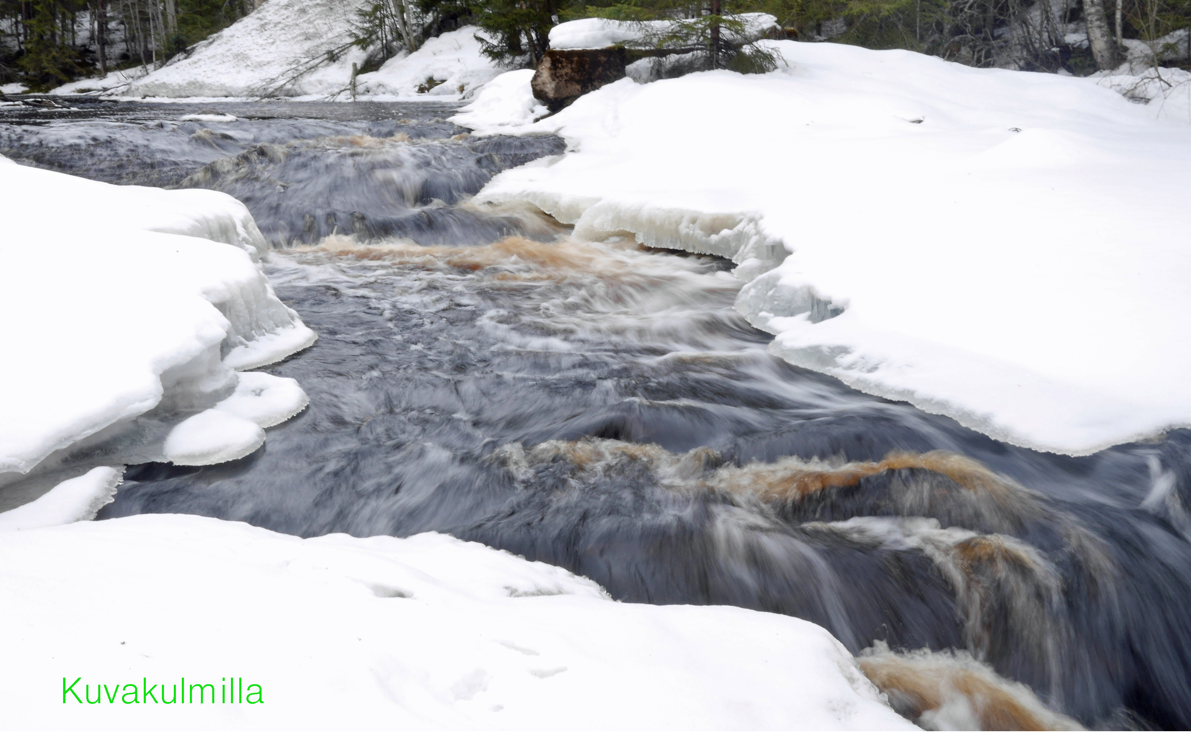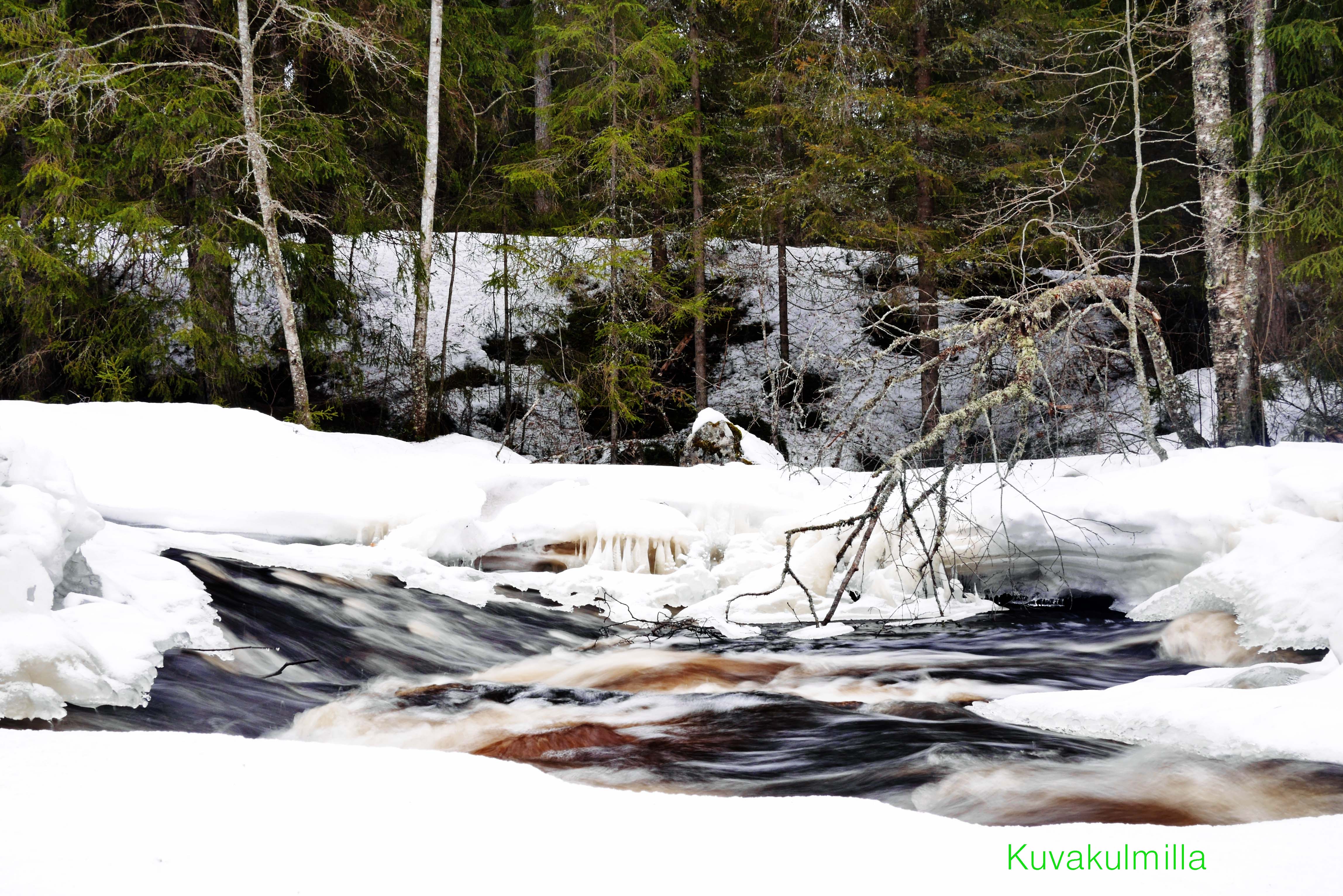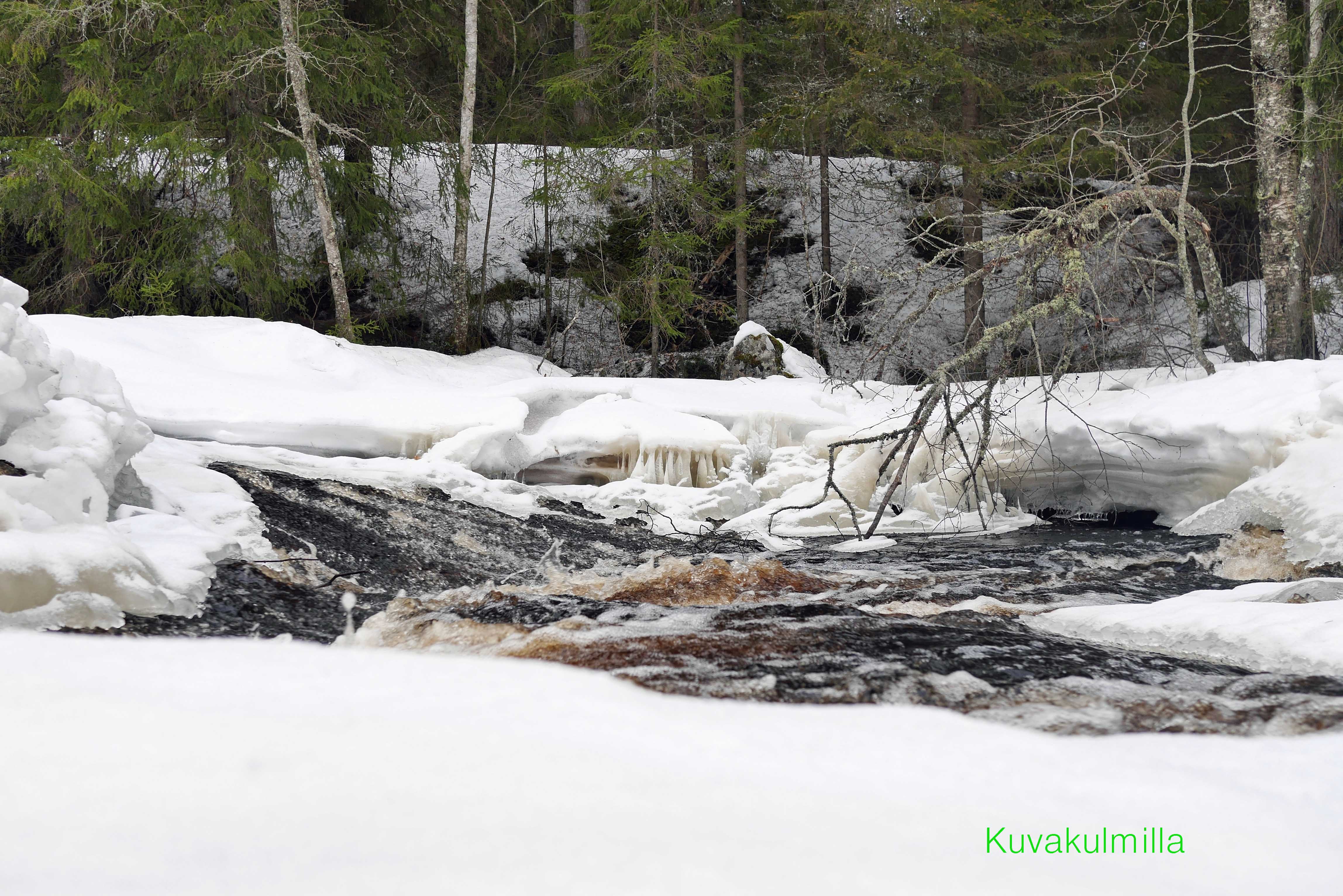 Multian Palsankoskella on yhä reilusti lunta ja yhä enemmän vettä. Tänään valoa oli niin paljon, että veden kuvaamisesta ei meinannut tulla mitään ilmaan lisäsuodinta kameraan. Harmaasuodin siis tilaukseen.