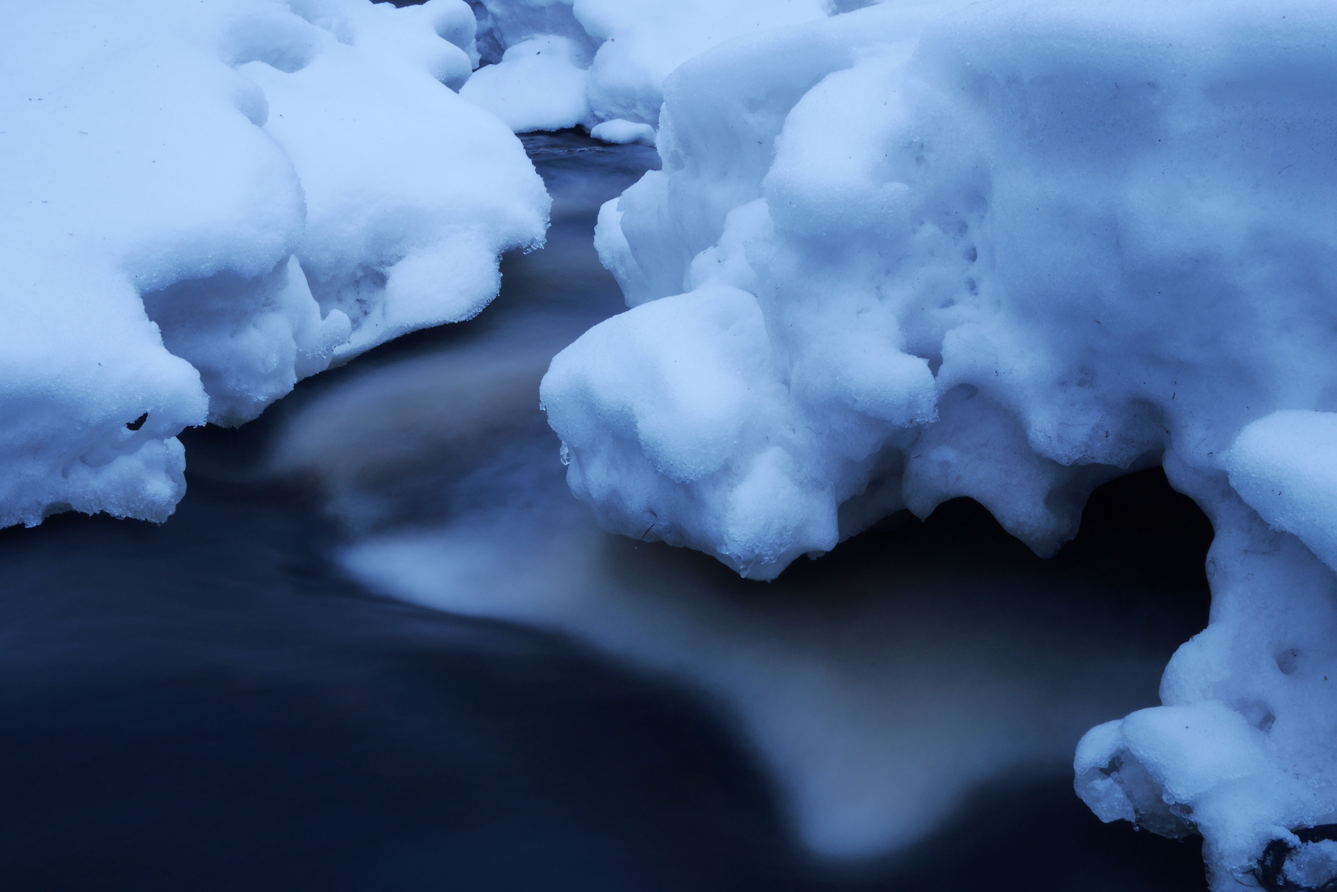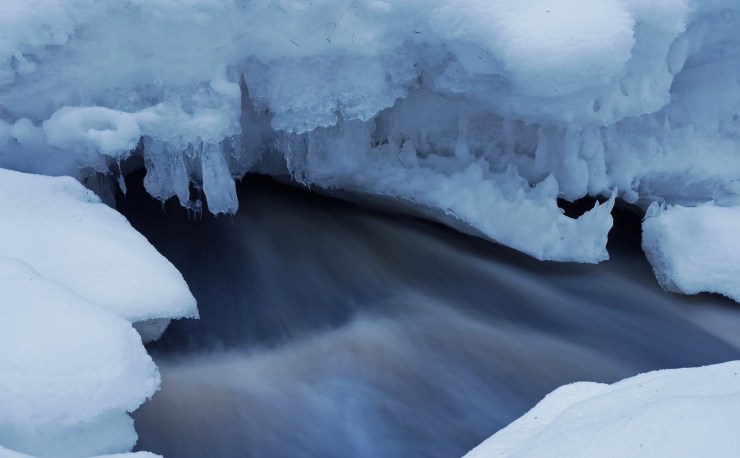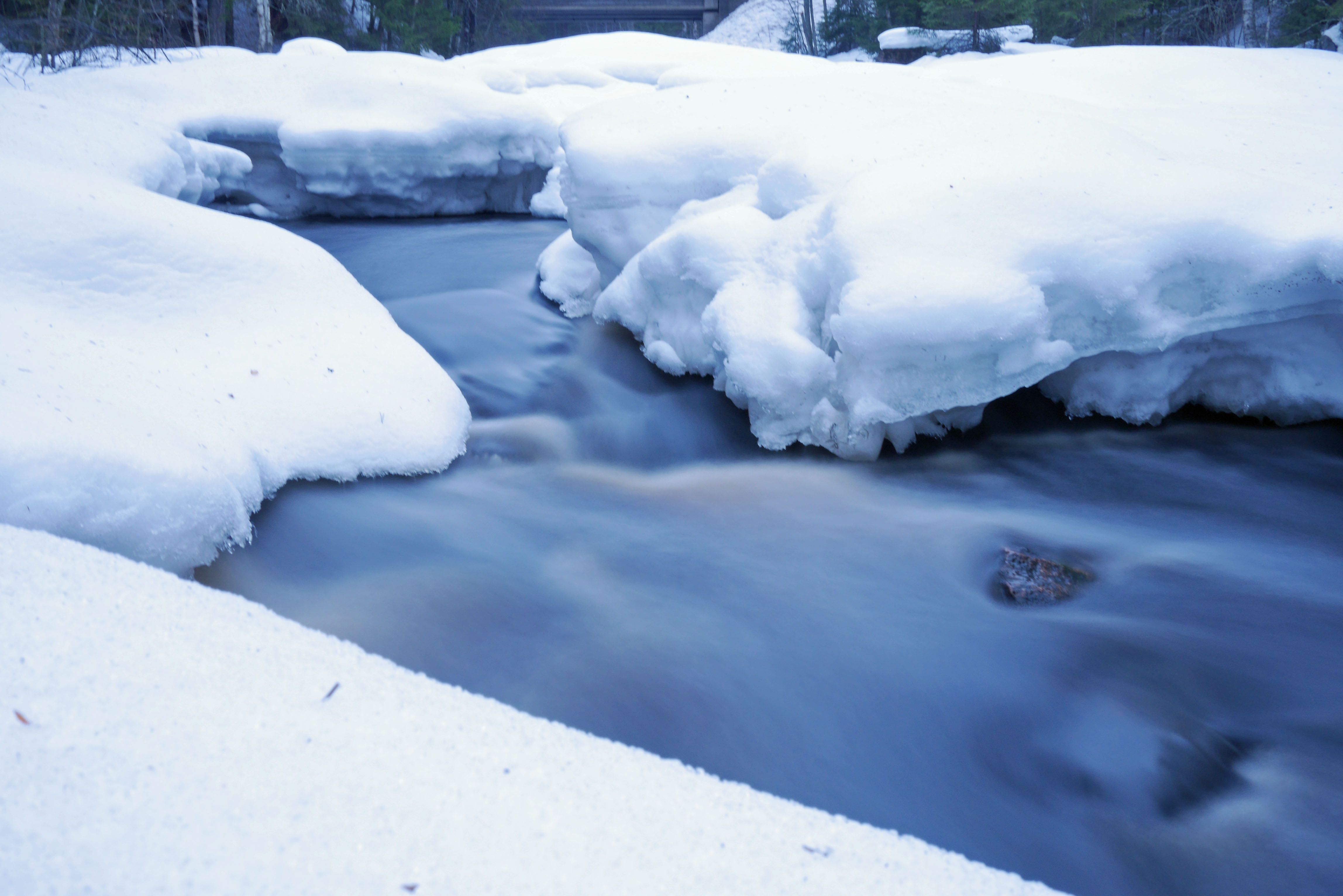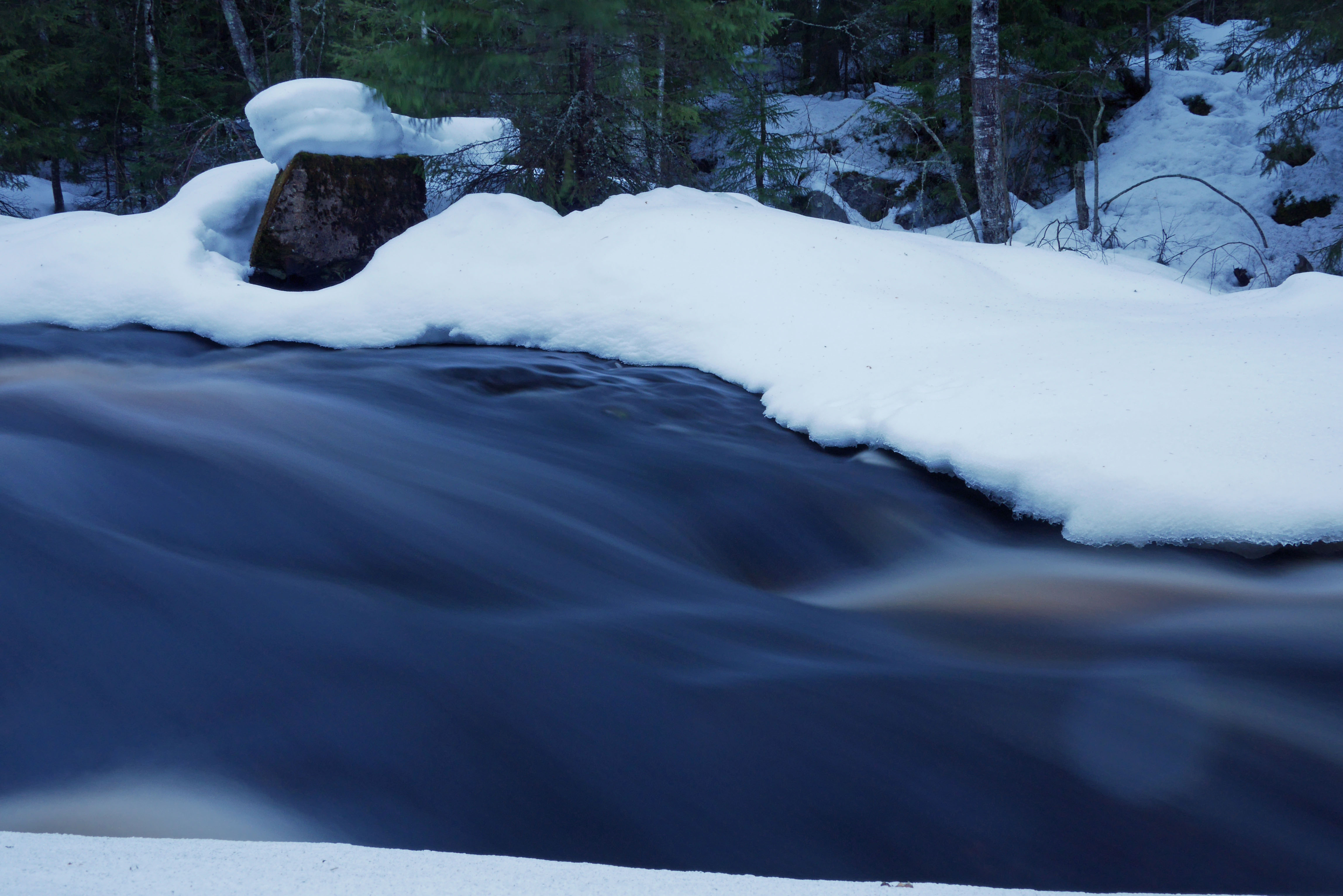 Multian Palsankoskella on yhä reilusti lunta ja yhä enemmän vettä. Tänään valoa oli niin paljon, että veden kuvaamisesta ei meinannut tulla mitään ilmaan lisäsuodinta kameraan. Harmaasuodin siis tilaukseen.